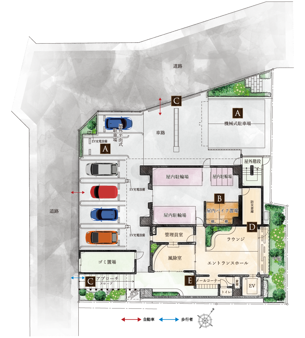住まう方の通路と、車の出入り口がそれぞれ独立しているので、小さなお子様なども安心安全の歩車分離設計を採用。